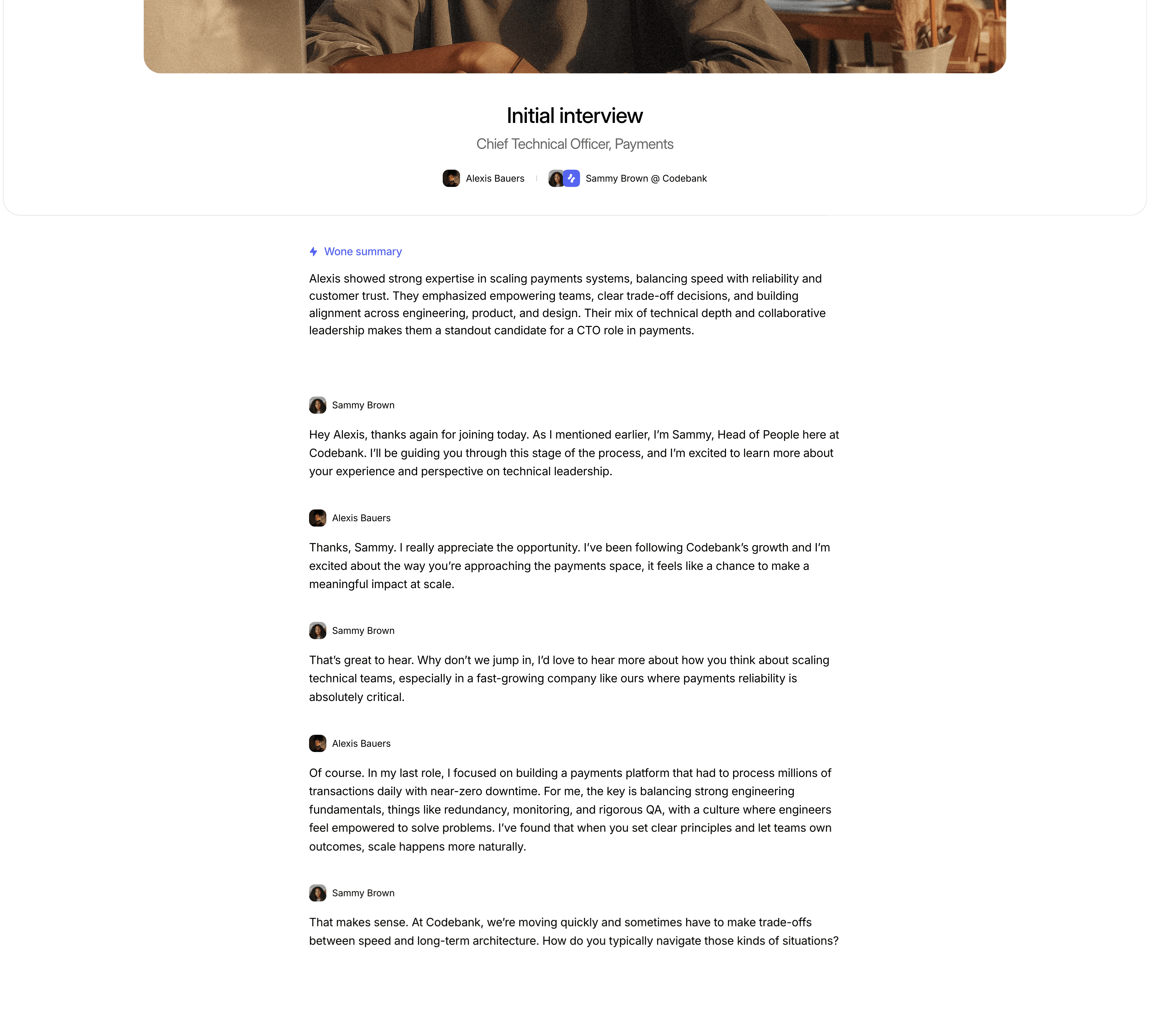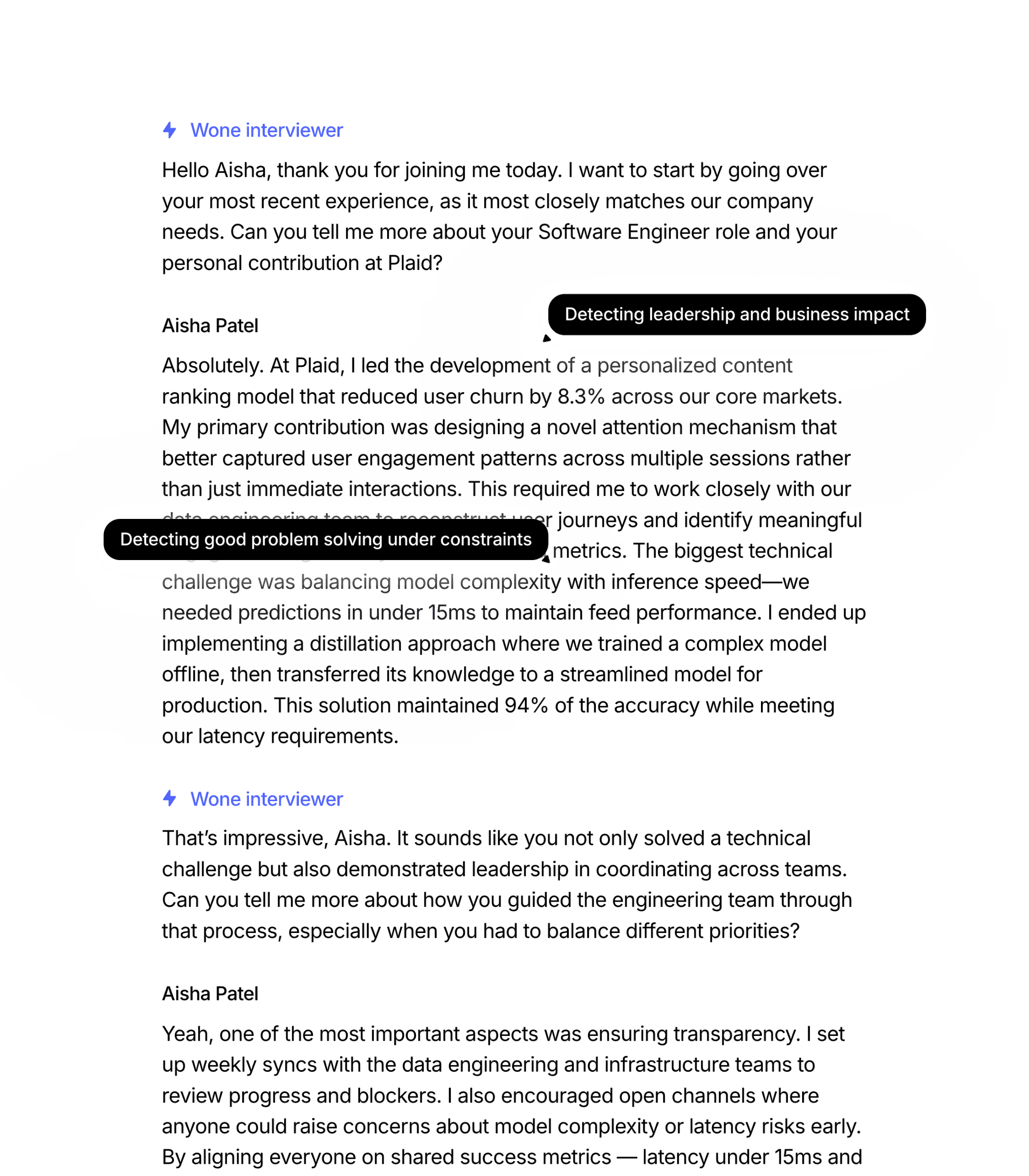 Wone analyzes interviews in real time and delivers clear summaries of each candidate’s performance. Immediately see who stands out and why.