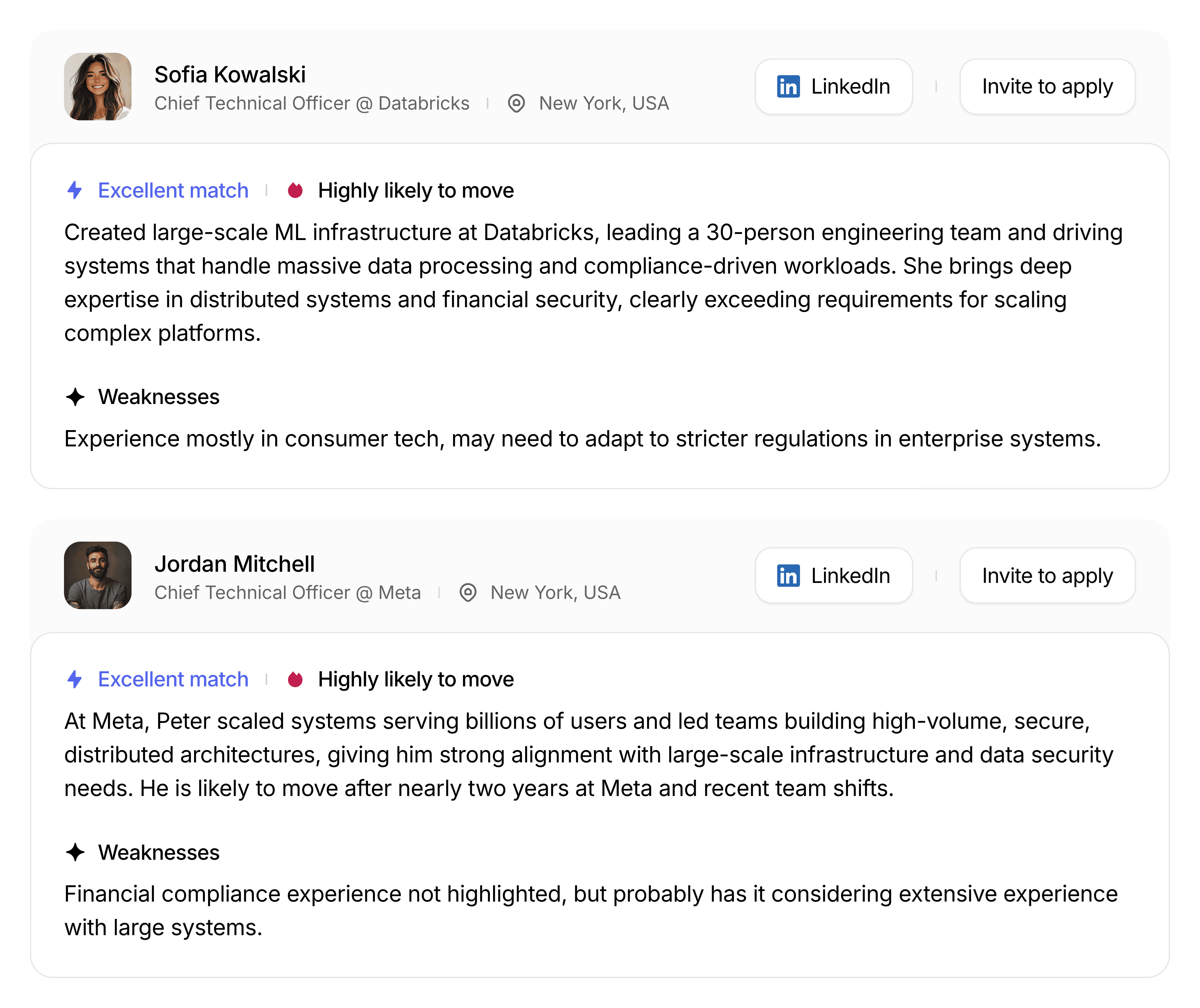 Each candidate comes with a clear explanation of why they're a strong fit as well as their match level.