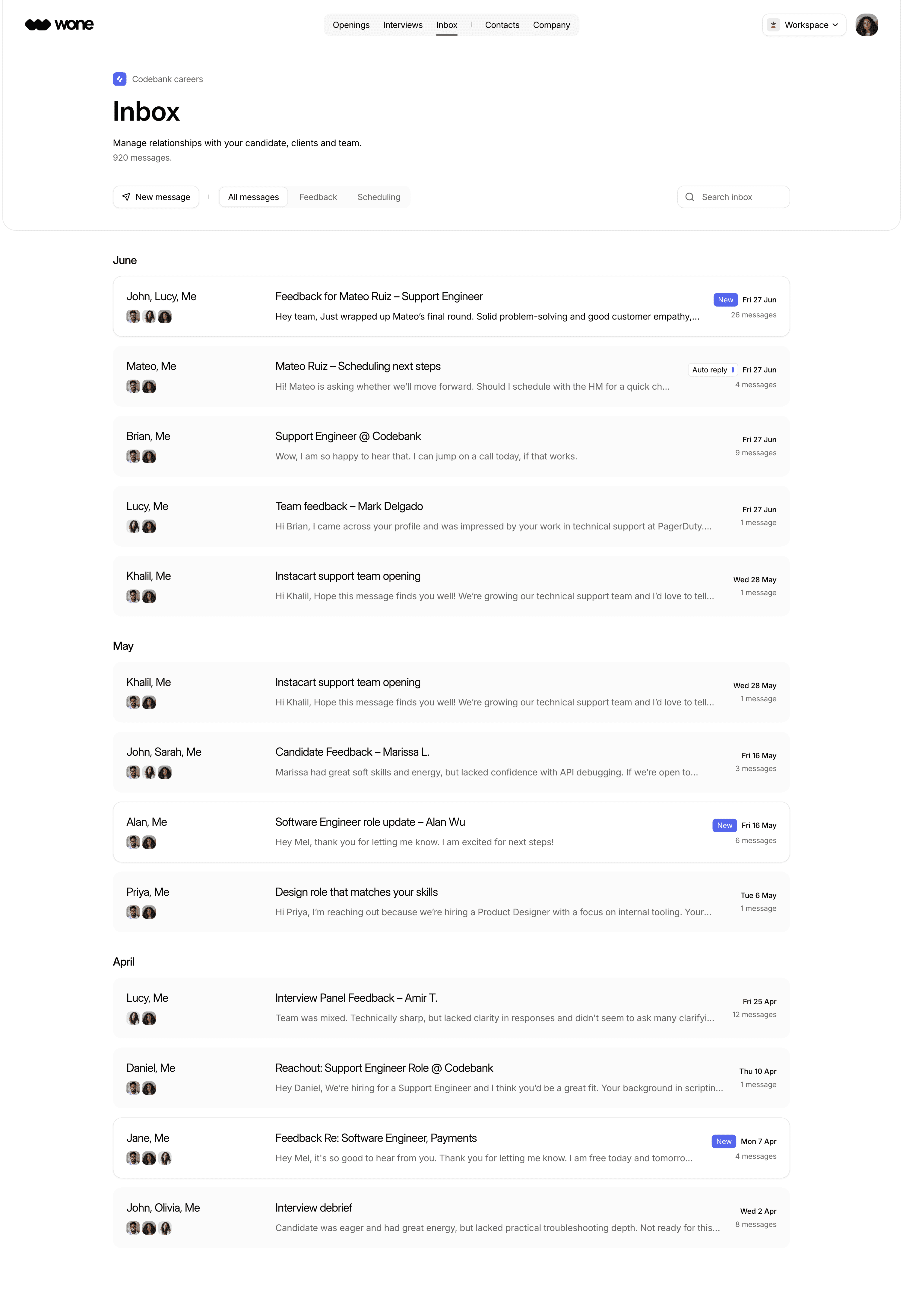 Wone actively finds candidates using natural language and contextual search, going beyond boolean filtering to find talent that matches your exact needs.