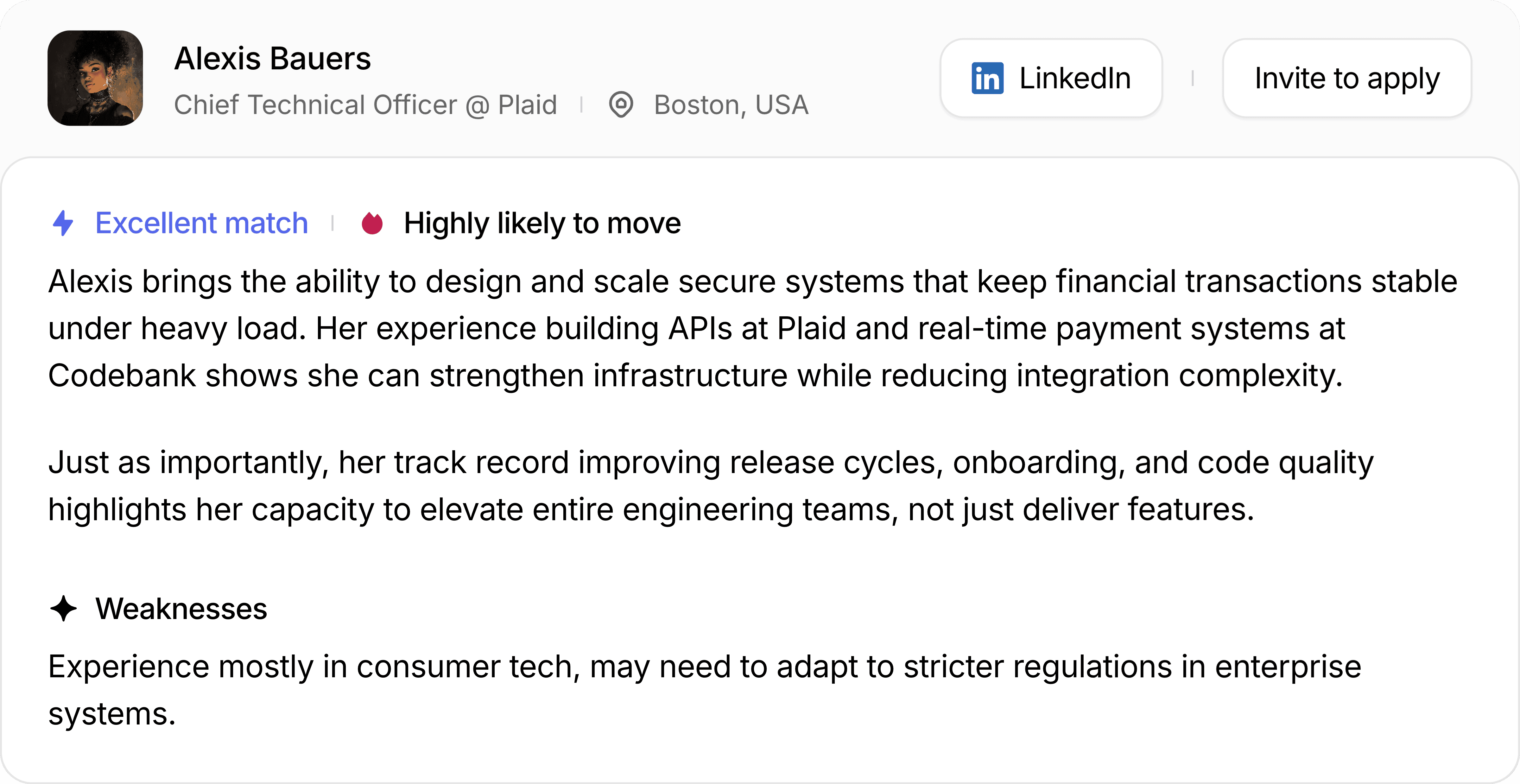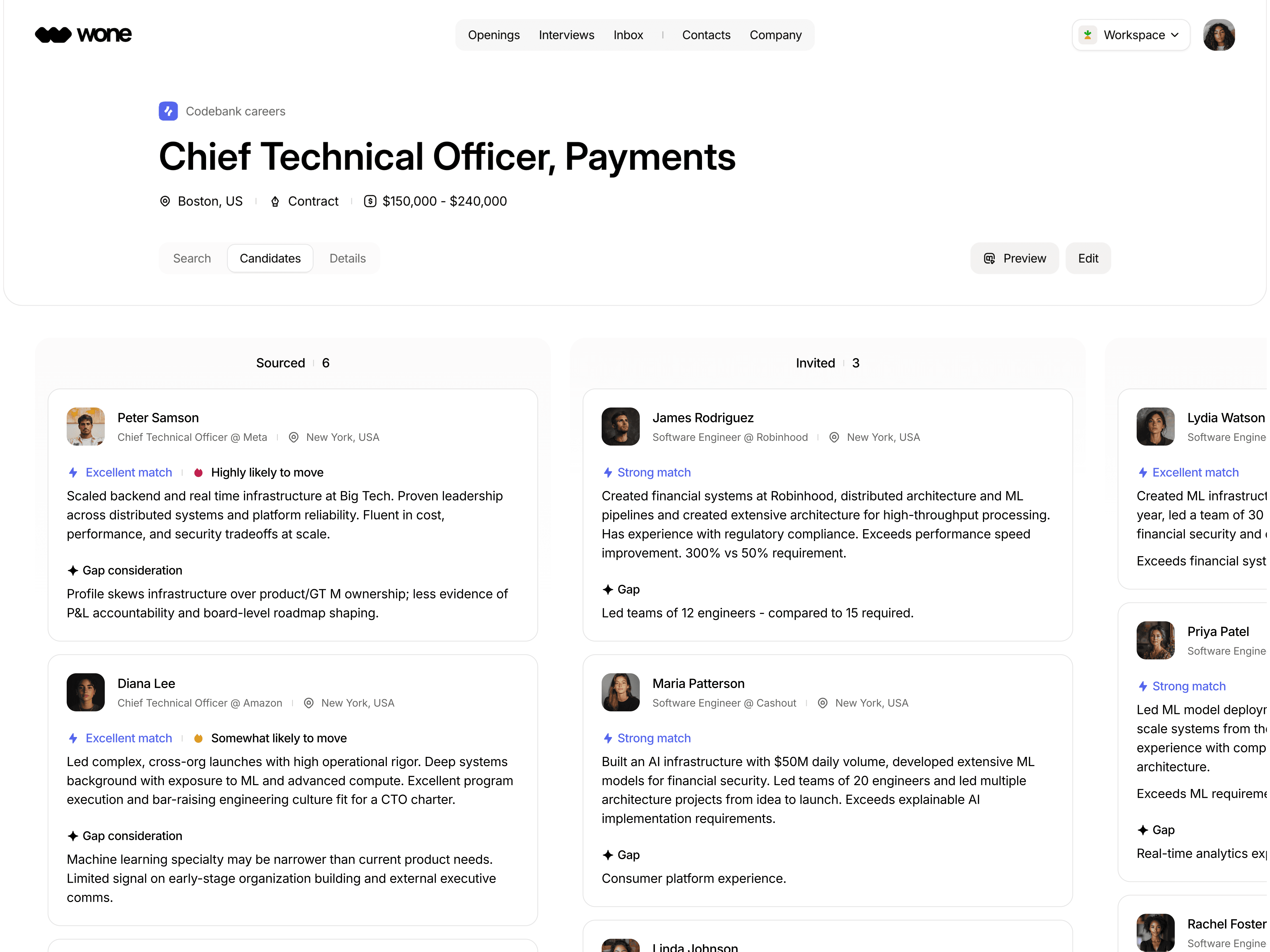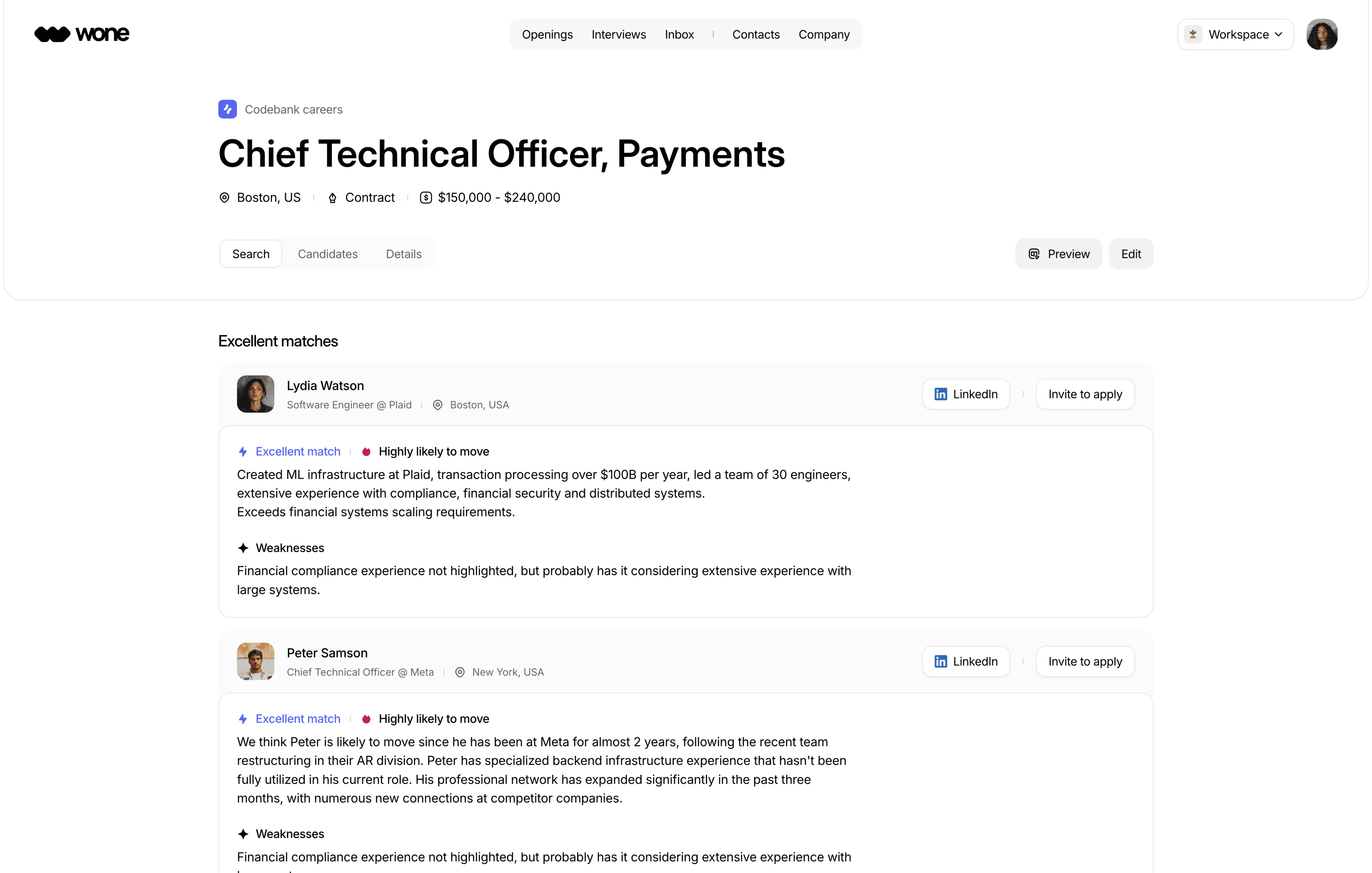 Wone’s deep evaluation goes beyond resume basics to spot true role fit, even when it isn’t obvious on a profile. It explains exactly why each candidate is a fit, along with any potential weaknesses.